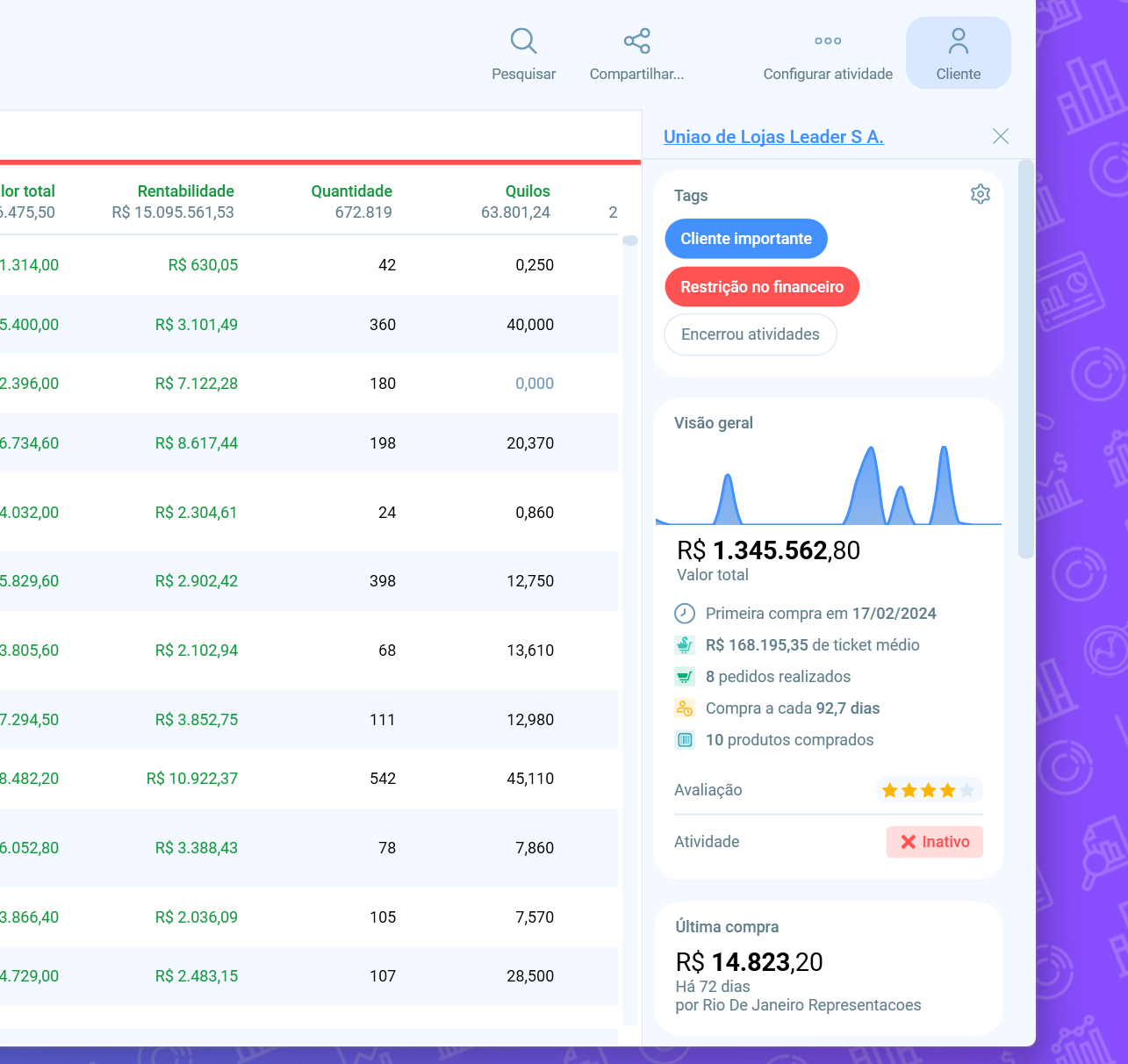 Nessa nova versão também trouxemos melhorias a essa barra, como um novo gráfico de vendas mais inteligente, que dá uma maior noção do histórico de vendas do cliente.